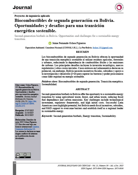 Ochoa Figueroa, J. F. (2025). Biocombustibles de segunda generación en Bolivia. Oportunidades y desafíos para una transición energética sostenible . Journal Boliviano De Ciencias, 21(58), 156–174. https://doi.org/10.52428/20758944.v21i58.1371