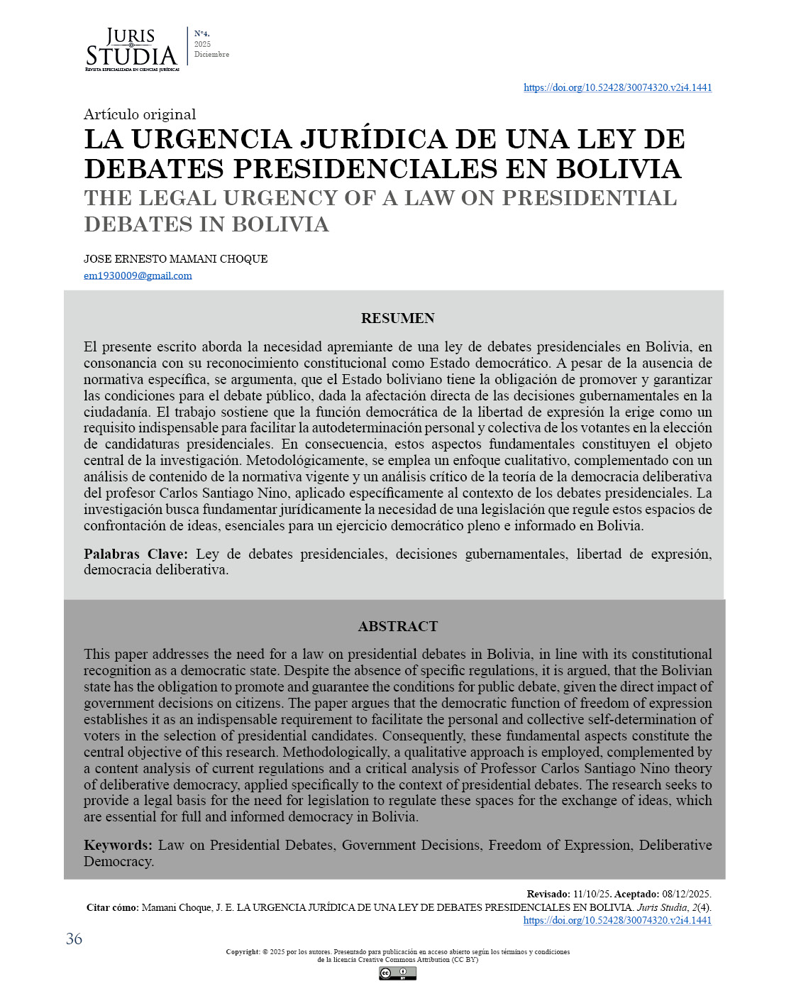 El presente escrito aborda la necesidad apremiante de una ley de debates presidenciales en Bolivia, en consonancia con su reconocimiento constitucional como Estado democrático. A pesar de la ausencia de normativa específica, se argumenta, que el Estado boliviano tiene la obligación de promover y garantizar las condiciones para el debate público, dada la afectación directa de las decisiones gubernamentales en la ciudadanía. El trabajo sostiene que la función democrática de la libertad de expresión la erige como un requisito indispensable para facilitar la autodeterminación personal y colectiva de los votantes en la elección de candidaturas presidenciales. En consecuencia, estos aspectos fundamentales constituyen el objeto central de la investigación. Metodológicamente, se emplea un enfoque cualitativo, complementado con un análisis de contenido de la normativa vigente y un análisis crítico de la teoría de la democracia deliberativa del profesor Carlos Santiago Nino, aplicado específicamente al contexto de los debates presidenciales. La investigación busca fundamentar jurídicamente la necesidad de una legislación que regule estos espacios de confrontación de ideas, esenciales para un ejercicio democrático pleno e informado en Bolivia.